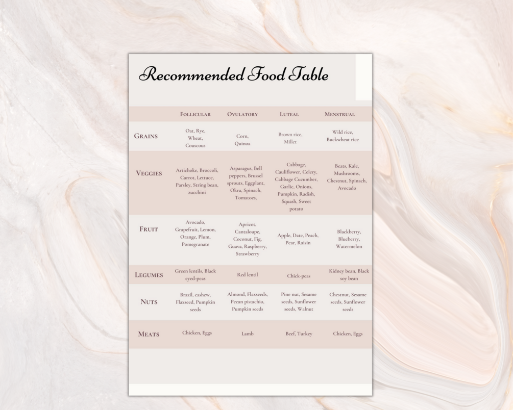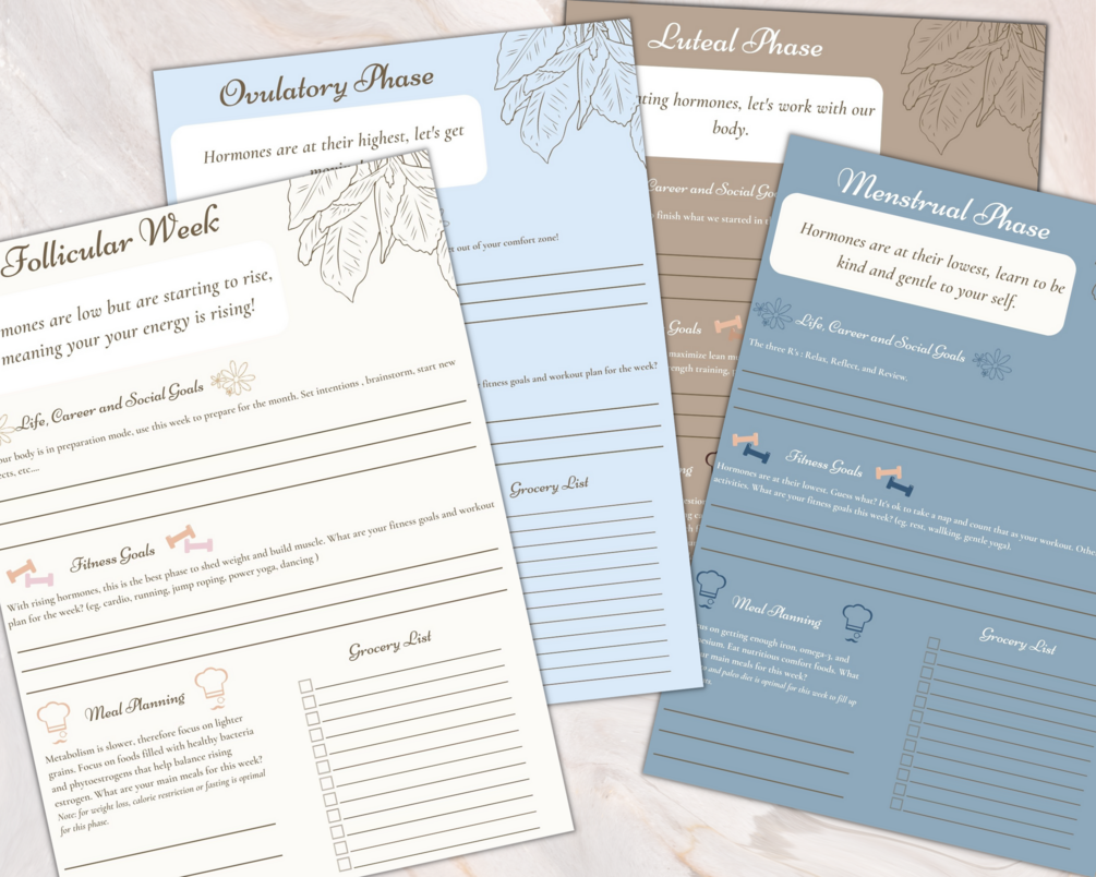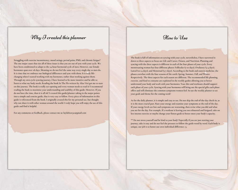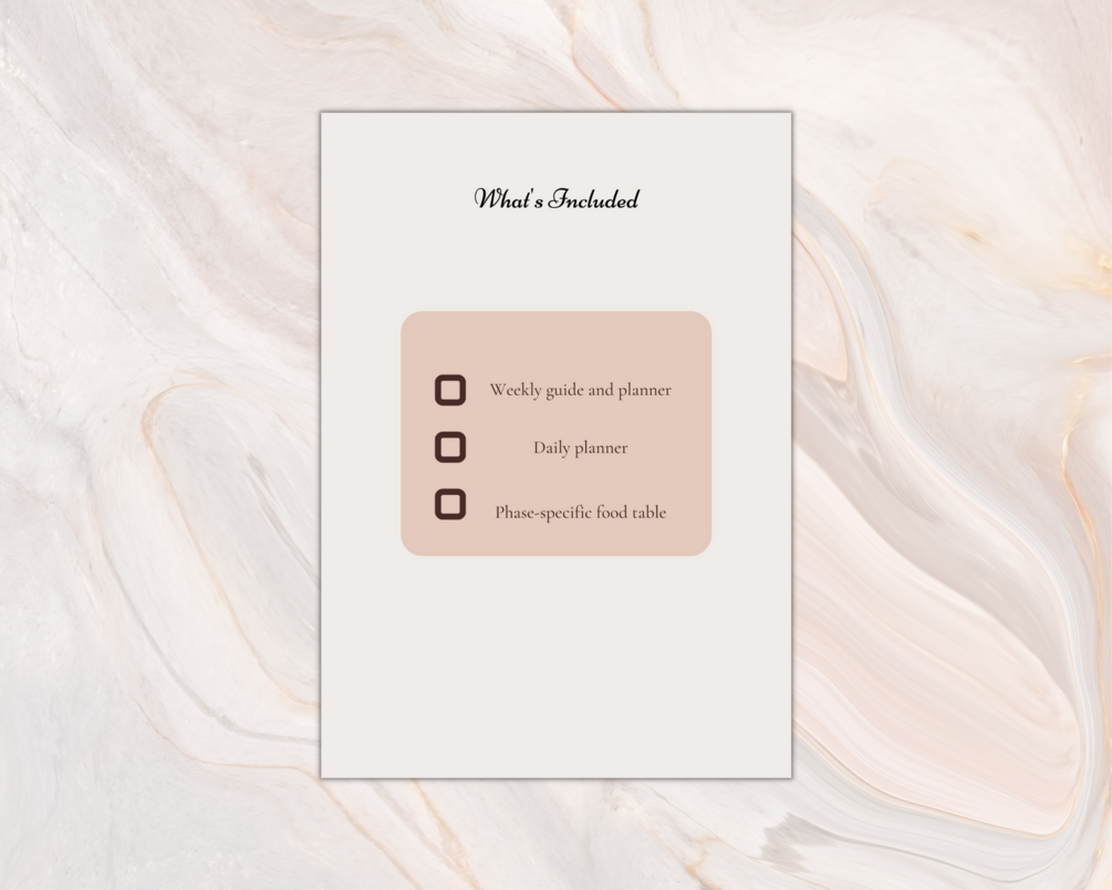 You will get a 17 page pdf that includes: Weekly guide and planner, daily planner, and a table of phase-specific food